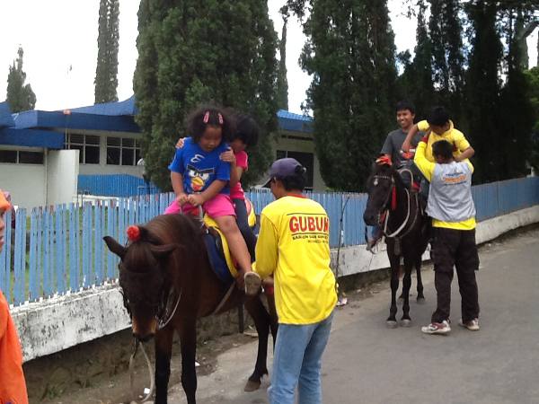 Anak-anak naik kuda keliling danau