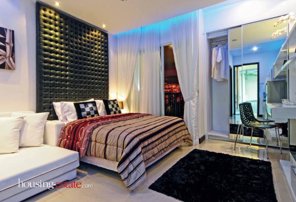 Area tempat tidur yang bersisian dengan balkon diangkat dengan impresi yang lebih feminin. Tampak dihadirkan pada detail dinding kepala ranjang (headboard) dengan bantalan berpola kotak-kotak setinggi plafon. Pilihan warna hitam pekat memberi daya tarik di antara dominasi warna putih.